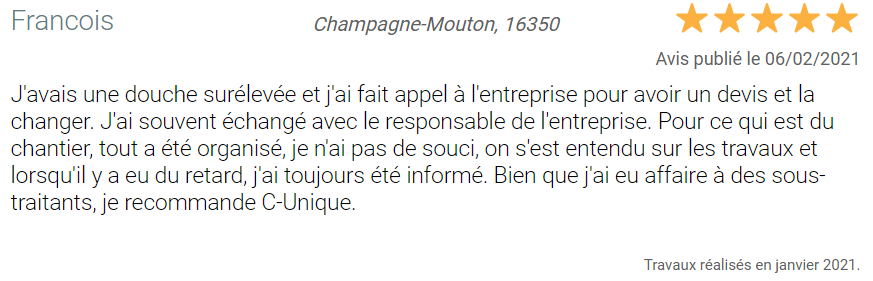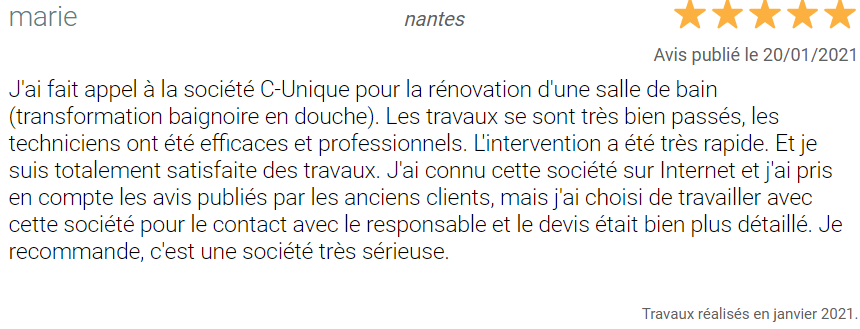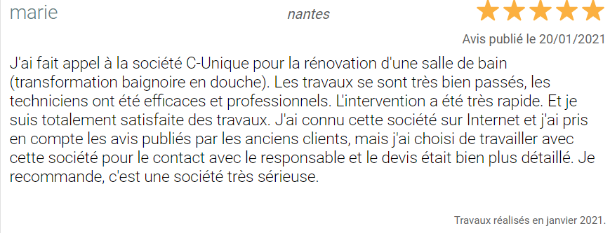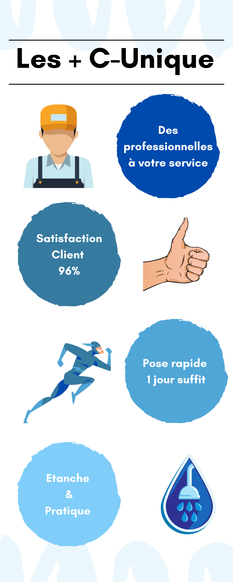 Votre interlocuteur unique vous suit à chaque étape. C-Unique change votre ancienne baignoire ou douche standard par une douche ou douche italienne personnalisée pratique et sécurisée en 1 jour seulement. Votre changement se fait en toute simplicité :